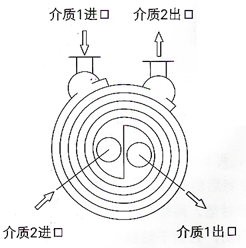 對于進行換熱的兩種介質,如果都是液體,在螺旋板式換熱器的六道中是按螺旋方向流動的,如圖二,并且按逆流的方式流動,所謂逆流是指相鄰流道中兩種液體流動的方向相反,這樣能使兩流體在相互傳熱的流程中始終保持一定的溫差,從而可獲得較好的效果。