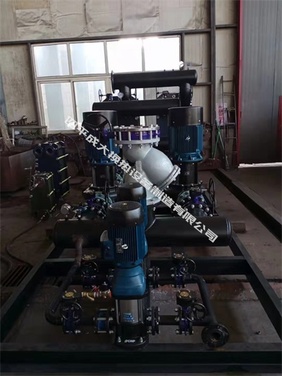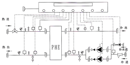 全自動無人值守現場控制換熱機組,具有手動控制換熱機組功能外,一次網配有電動調節閥,控制二次網的供水溫度,具有室外溫度補償功能,循環泵采用變頻控制,利用二次網供回水壓差作為反饋信號,二次網進行變量控制,不水泵采用變頻補水,根據二次網回水壓差作為反饋信號。所有水泵,電動調節閥,二次網供水溫度等均由控制器來完成全自動控制,并且控制器能夠控制程序來自動完成機組的啟停及復電后重新啟動,一個水箱水位傳感器接入控制器自動控制水箱水位。而且具有缺水保護不水泵功能;二次網回水管線加裝卸壓裝置,正常情況下,該機組處于無人值守自動運行狀態,只需工作人員定期進行巡查。